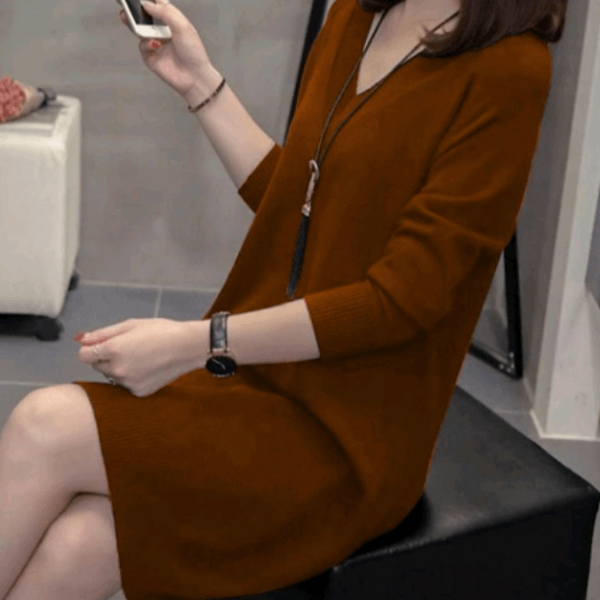 Dress rajut memberikan tampilan feminin yang elegan. Cocok untuk acara semi-formal maupun santai.
